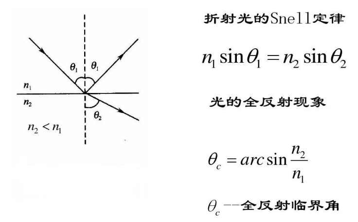 當光射到兩種介質界面,只產生反射而不產生折射的現象.當光由光密介質射向光疏介質時,折射角將大于入射角.當入射角增大到某一數值時,折射角將達到90°,這時在光疏介質中將不出現折射光線,只要入射角大于上述數值時,均不再存在折射現象,這就是全反射.所以產生全反射的條件是:①光必須由光密介質射向光疏介質.②入射角必須大于臨界角。臨界角是折射角為90度時對應的入射角