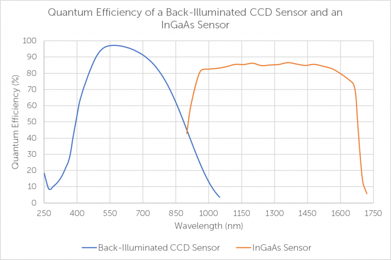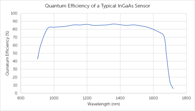 InGaAs傳感器的帶隙能量通常低于硅,這意味著它們能夠檢測更長的波長,例如短波紅外(SWIR)區域(900-1700nm)。因此,InGaAs傳感器在950-1600nm區域內的QE>80%。如圖顯示了典型InGaAs傳感器的QE曲線。